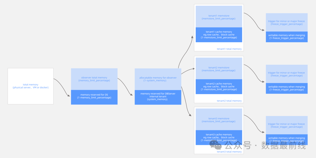 OceanBase 数据库是一个支持多租户架构的准内存级的分布式数据库,对大容量内存的管理和使用提出了很高的要求。实际使用上,OceanBase 倾向于将更多的系统内存划分给数据库,由数据库进行统一管理。具体的内存结构,可以分为操作系统预留内存、OBServer预留内存、租户内存等四个层次。