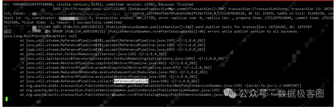 如果你使用的是 Doris 2.1.3 或 2.1.4-rc01/02 版本,程序的 Bug 可能导致 FE 的 publish version 线程挂了。别慌,这个问题会导致大部分事务卡在 commit 状态,处理起来也相对简单。