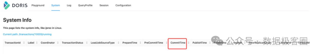 如果是事务永久卡死,排查起来稍微复杂一些。你可以在fe http面板(fe ip + 8030端口)里,依次点击 system => transaction =>=> running,按commitTime 进行升序排列,看下最早的事务是不是卡死了。如果有很多commitTime 为空的,那按第一列的TransactionId 升序排列也可以,看下它是不是很早的事务了( commit time都可以)。