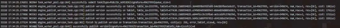 如果事务没有卡死,但系统反应慢了,可能是 FE publish version 被拖慢了。检查 FE 的日志,看是否有以下关键字: