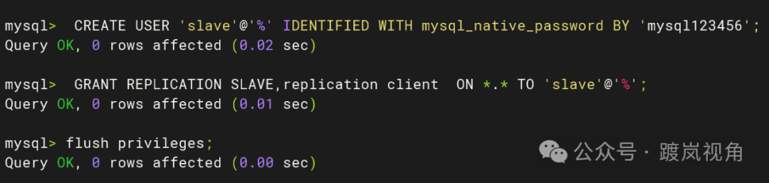 mysql_native_password BY 'mysql123456'; GRANT REPLICATION SLAVE,replication client ON *.* TO 'slave'@'%'; flush privileges; |