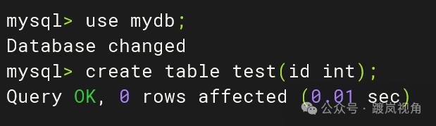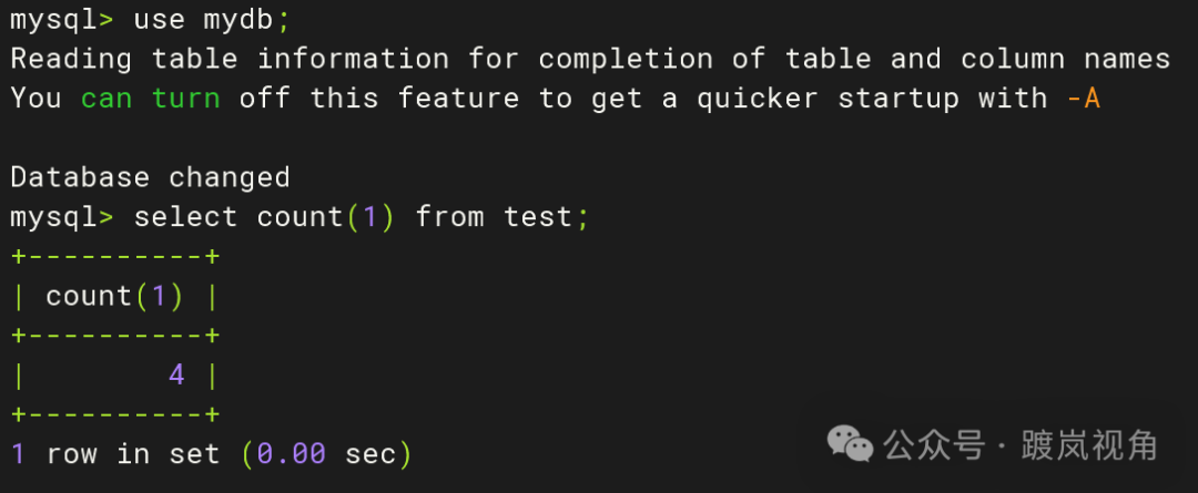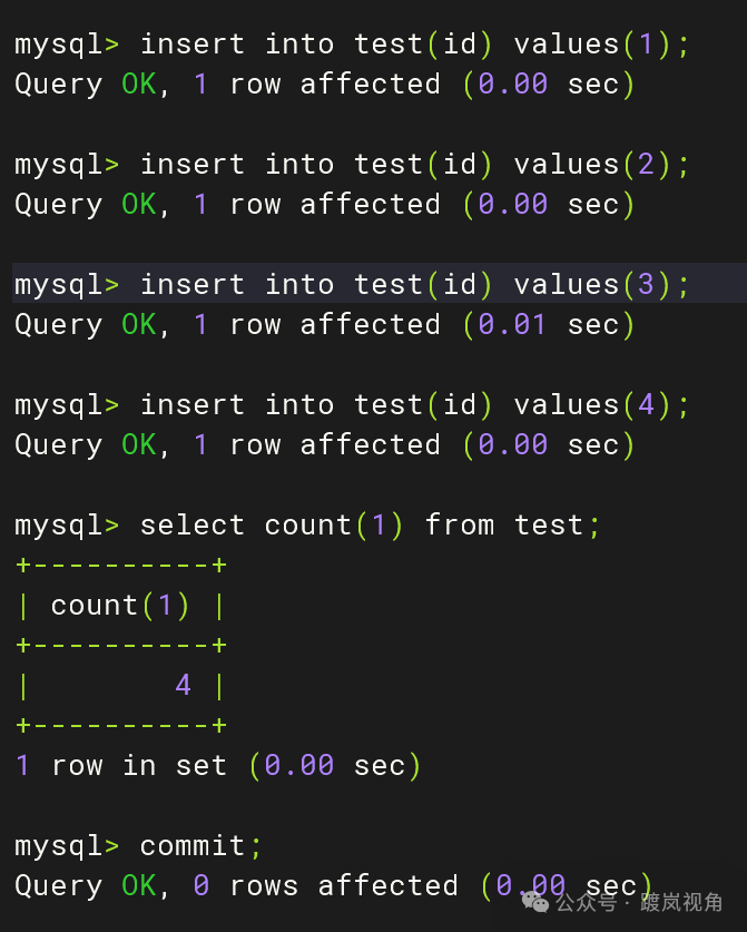 use mydb; insert into test(id) values(1); insert into test(id) values(2); insert into test(id) values(3); insert into test(id) values(4); select count(1) from test; commit; |