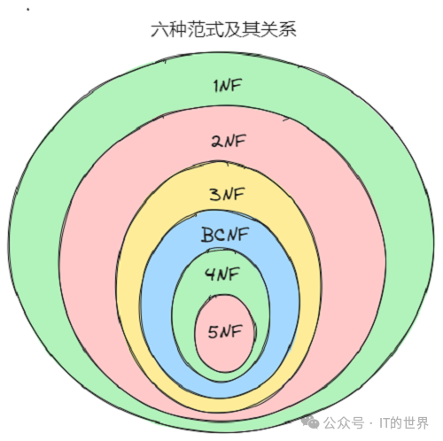; 目前常见的范式分为六种,各种范式呈层级递增,越高的范式数据库冗余越小。具体的关系如下如所示: