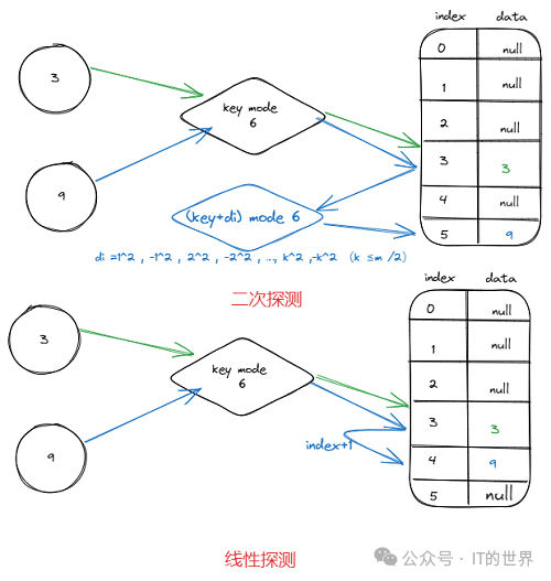 等方法,下图给出了线性探测和二次探测的比较: