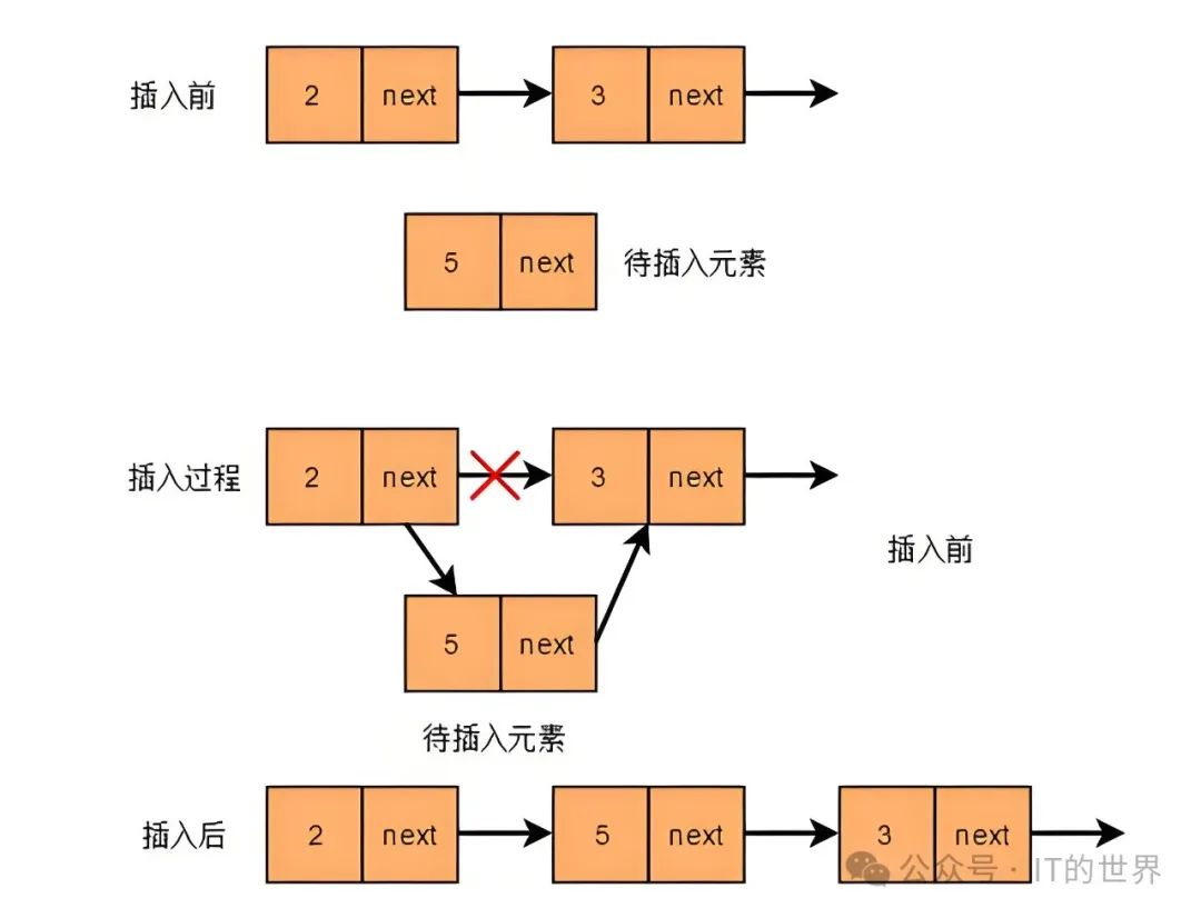 要在链表中插入节点,首先需要找到要插入位置的前一个节点,然后将新节点插入到其后面。如图:
