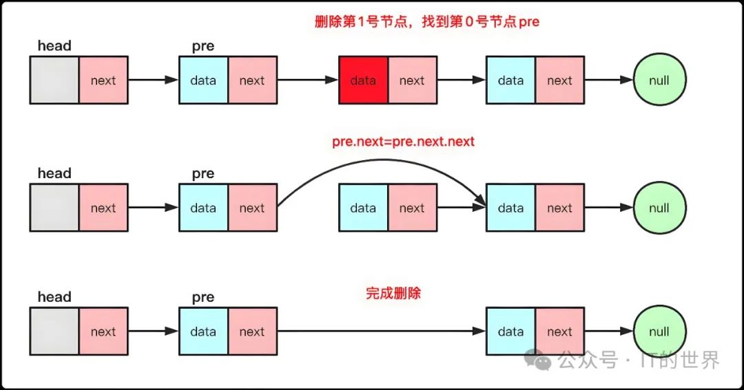 当你删除链表中的一个节点时,你需要更新前一个节点的 next 指针,使其跳过被删除的节点,指向被删除节点的下一个节点。这样就可以将被删除节点从链表中移除。如图: