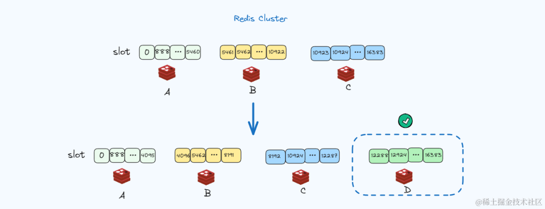 新增一个节点D,redis cluster的这种做法是从各个节点的前面各拿取一部分slot(槽)到D上,会变成这样: