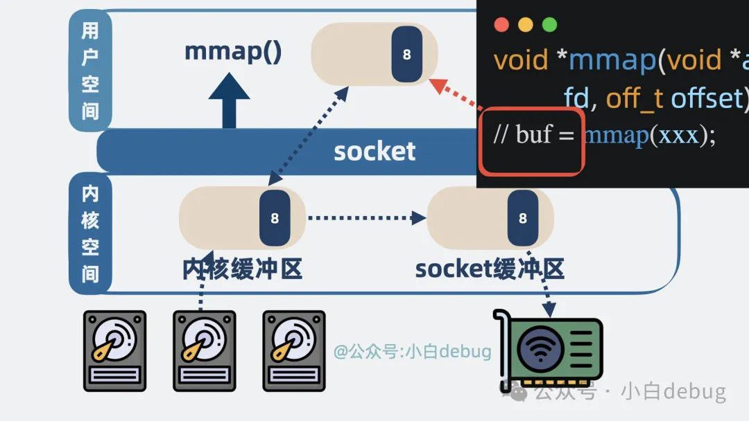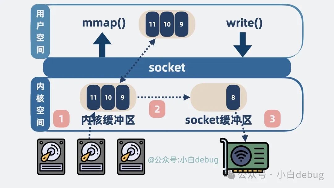 看到这里大家估计也蒙了,不是说零拷贝吗?怎么还有 3 次拷贝。mmap 作为一种零拷贝技术,指的是用户空间到内核空间这个过程不需要拷贝,而不是指数据从磁盘到发送到网卡这个过程零拷贝。