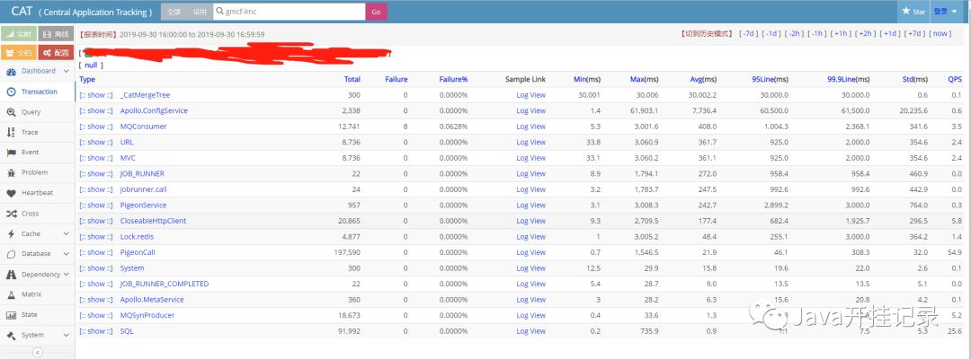 Transaction报表:一段代码的运行时间、次数、比如URL/cache/sql执行次数相应时间