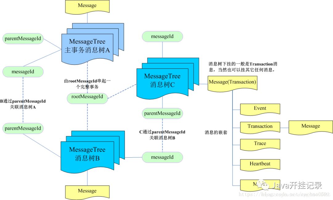 CAT调用链,是将每次的系统调用封装成一个完整的消息树,消息树可能包含上面的5种消息类型,每个消息树之间通过rooMessageId和parentMessageId串起来,从而形成整个调用链