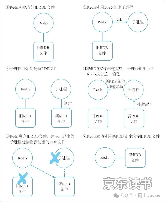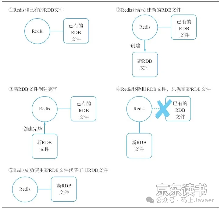1)创建一个子进程2)子进程执行SAVE命令,创建新的RDB文件3)RDB文件创建完毕后,子进程退出并通知Redis服务器进程(父进程)新RDB文件已经完成4)Redis服务器进程进行新RDB文件替换已有的RDB文件