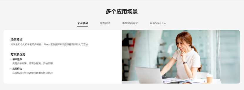 云数据库是在云计算的大背景下发展起来的一种新兴的共享基础架构的方法,它极大地增强了数据库的存储能力,消除了人员、硬件、软件的重复配置。比如,相比本地自建数据库节省软硬件基础设施成本,Flexus 云数据库 RDS 无需部署安装,无需购买任何软硬件,只需支付实例费用,可按需购买、弹性伸缩,且参数配置从 30+降低至 5 个,按套餐一键购买,极大地降低了技术门槛和资金门槛,让更多中小企业也能享受到云计算发展的红利。