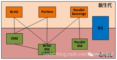 可以看到上三种适用于新生代的复制算法,下三种适用于老年代的标记清除、标记整理算法,整个垃圾收集过程需要上下配合并且有链接的收集器才能配合使用,而G1都适用