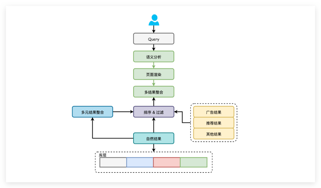 我们在上文中谈及的自然结果,都是来源于各个库层的结果,即库检索阶段的结果,接下来我们看下常见的搜索引擎基本架构。