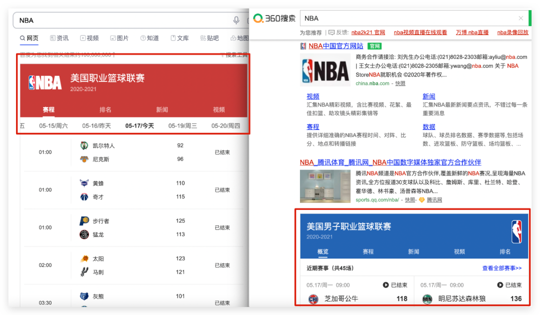 能够发现,NBA相关赛事的比分和详情在两个引擎中能够检索到,但是最直观的数据板展现,百度明显做的更好一些。用户搜索NBA,一般都会关注当天的比分、球队排名、新闻等情况,但是在360中,这类整合数据,仅仅排在了第三条结果,从用户需求及产品的角度而言,这是一个Bad Case。
