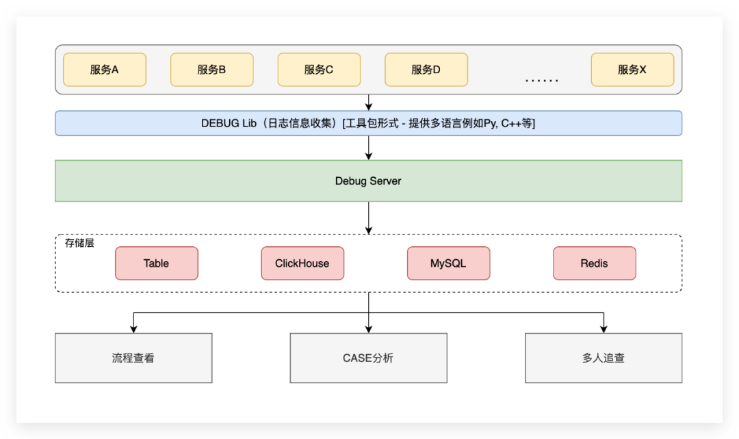该图中的服务层即对应整个搜索架构中的所有微服务,由于各个微服务采用不同于语言开发,因此在Debug侧,提供了多语言开发的Debuglib用于收集各个服务中的阶段信息,信息收集主要需要遵循几个标准:
