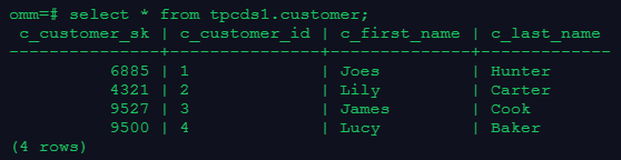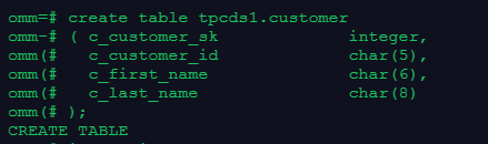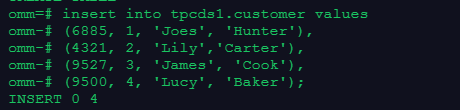4.在模式tpcds1中建表customer、插入记录和查询记录
