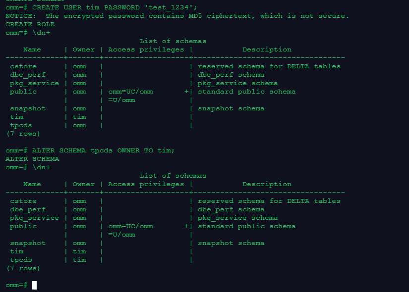 2.创建一个用户tim, 并将tpcds的owner修改为tim,且修改owner前后分别使用\dn+查看模式信息