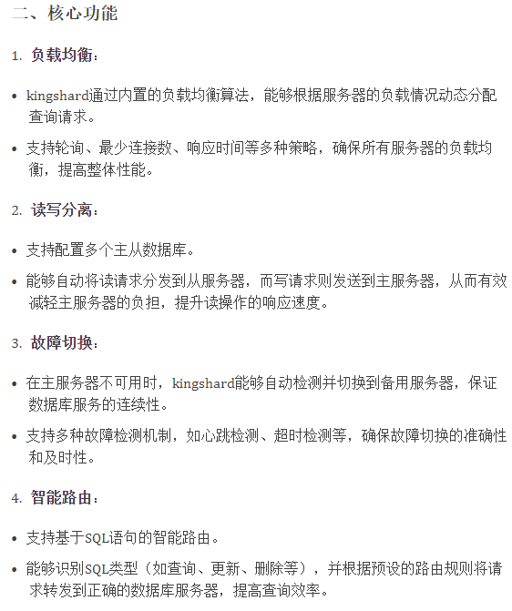 •kingshard的配置文件采用YAML格式,用户可以根据需要自定义配置。•支持读写分离、分库分表、负载均衡等多种配置选项。