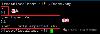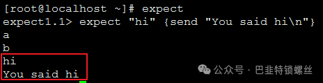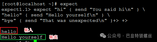 [root@localhost ~]# expectexpect1.1> send"hello china\n"hello china