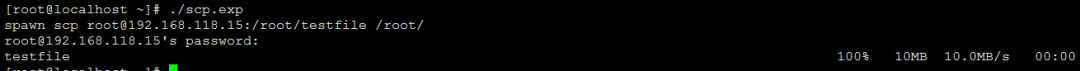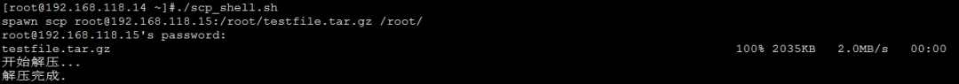 #!/bin/bashhost="192.168.118.15"username="root"password="123456"expect <<EOFsettimeout 3spawnscp$username@$host:/root/testfile.tar.gz/root/expect"*yes/no*"{send"yes\r"}expect"*password*"{send"$password\r"}settimeout -1expect"100%"expect eofEOFecho'开始解压...'tarxf testfile.tar.gzif[ $? -eq0 ];thenecho'解压完成.'fi