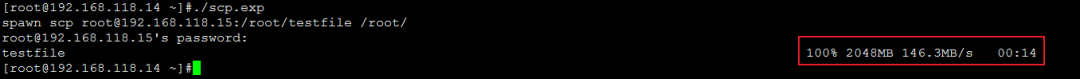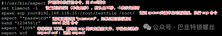 #!/usr/bin/expectsettimeout -1spawnscproot@192.168.118.15:/root/testfile/root/expect"*password*"send"123456\r"expect"100%"expect eof