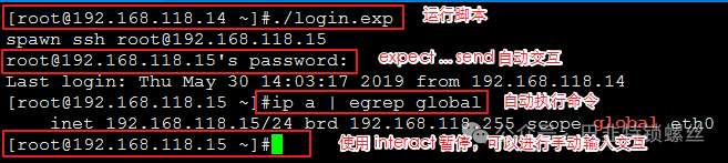 #!/usr/bin/expectsettimeout -1spawnsshroot@192.168.118.15expect"*password*"send"123456\r"expect"#*"send"ip a | egrep global\r"interact