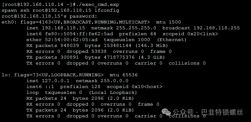 #!/usr/bin/expectsettimeout 3sethost"192.168.118.15"setusername"root"setpassword"123456"spawnssh$username@$hostifconfigexpect"*yes/no*"{send"yes\r"}expect"*password*"{send"$password\r"}expect eof