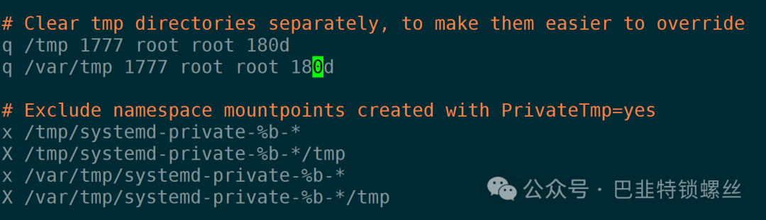 # Clear tmp directoriesD tmp 1777 root root 10dD var/tmp 1777 root root 30d