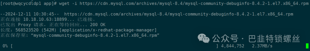 [root@wqcycdldp1 app]# wget -i https://cdn.mysql.com/archives/mysql-8.4/mysql-community-debuginfo-8.4.2-1.el7.x86_64.rpm--2024-12-11 10:30:45-- https://cdn.mysql.com/archives/mysql-8.4/mysql-community-debuginfo-8.4.2-1.el7.x86_64.rpm正在连接 10.18.10.63:18899... 已连接。已发出 Proxy 请求,正在等待回应... 200 OK长度:568523520 (542M) [application/x-redhat-package-manager]正在保存至: “mysql-community-debuginfo-8.4.2-1.el7.x86_64.rpm”30% [======================> ] 171,112,752 8.25MB/s 剩余 48s ^C