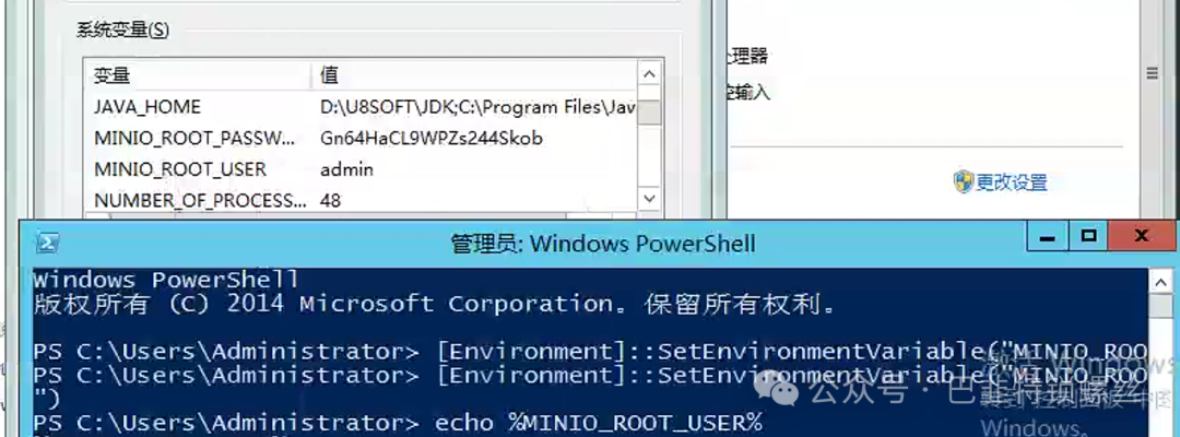 [Environment]::SetEnvironmentVariable("MINIO_ROOT_USER", "admin", "Machine")[Environment]::SetEnvironmentVariable("MINIO_ROOT_PASSWORD", "Gn64HaCL9WPZs244Skob", "Machine")