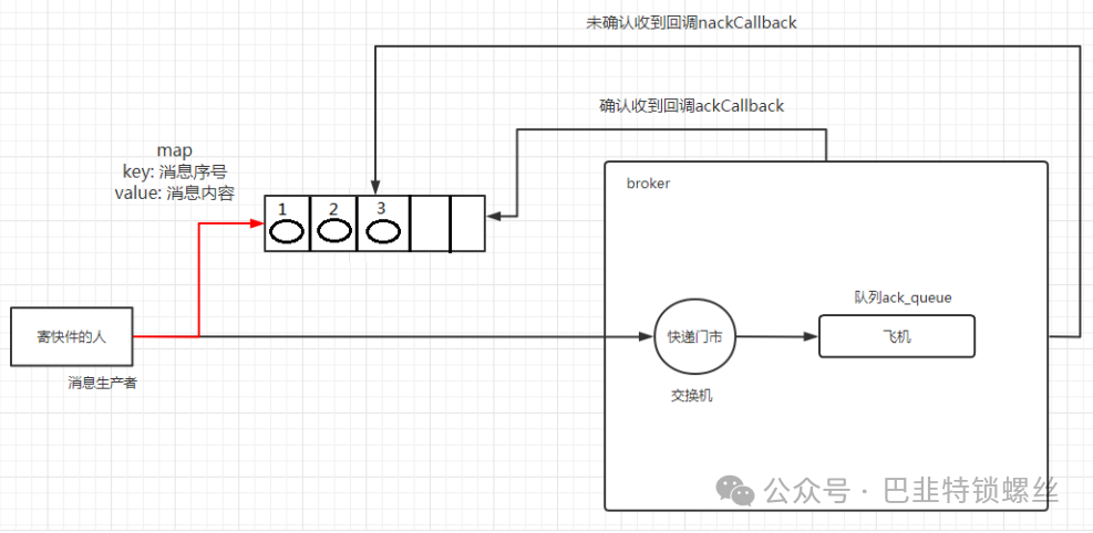 当我们的信道被设置成发布确认(confirm)模式,那么所有在该信道上面发布的消息都会被指派一个唯一的ID,一旦消息成功投递,broker就会发送一个确认给生产者,生产者此时就知道消息已经投递成功,生产者就会把这条消息进行删除。