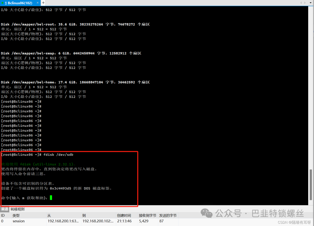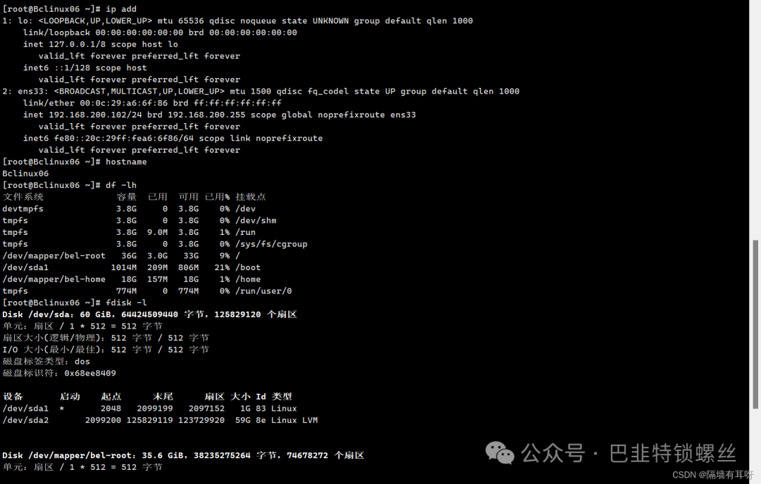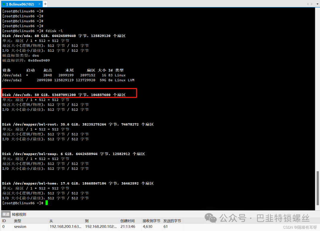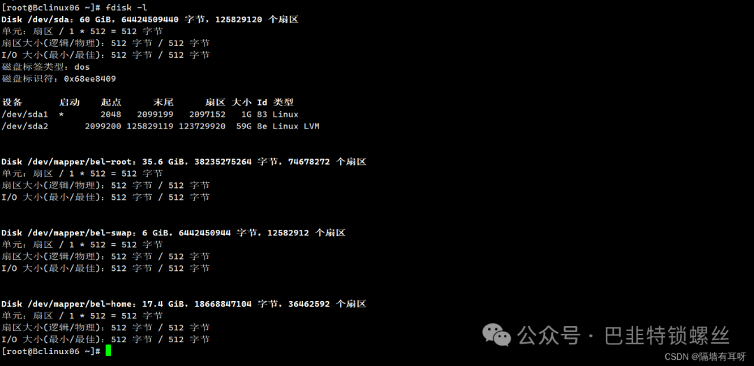 [root@Bclinux06 ~]# fdisk -lDisk /dev/sda:60 GiB,64424509440 字节,125829120 个扇区单元:扇区 / 1 * 512 = 512 字节扇区大小(逻辑/物理):512 字节 512 字节I/O 大小(最小/最佳):512 字节 512 字节磁盘标签类型:dos磁盘标识符:0x68ee8409设备 启动 起点 末尾 扇区 大小 Id 类型/dev/sda1 * 2048 2099199 2097152 1G 83 Linux/dev/sda2 2099200 125829119 123729920 59G 8e Linux LVMDisk /dev/sdb:50 GiB,53687091200 字节,104857600 个扇区单元:扇区 / 1 * 512 = 512 字节扇区大小(逻辑/物理):512 字节 / 512 字节I/O 大小(最小/最佳):512 字节 / 512 字节Disk /dev/mapper/bel-root:35.6 GiB,38235275264 字节,74678272 个扇区单元:扇区 / 1 * 512 = 512 字节扇区大小(逻辑/物理):512 字节 / 512 字节I/O 大小(最小/最佳):512 字节 / 512 字节Disk /dev/mapper/bel-swap:6 GiB,6442450944 字节,12582912 个扇区单元:扇区 / 1 * 512 = 512 字节扇区大小(逻辑/物理):512 字节 / 512 字节I/O 大小(最小/最佳):512 字节 / 512 字节Disk /dev/mapper/bel-home:17.4 GiB,18668847104 字节,36462592 个扇区单元:扇区 / 1 * 512 = 512 字节扇区大小(逻辑/物理):512 字节 / 512 字节I/O 大小(最小/最佳):512 字节 / 512 字节[root@Bclinux06 ~]#