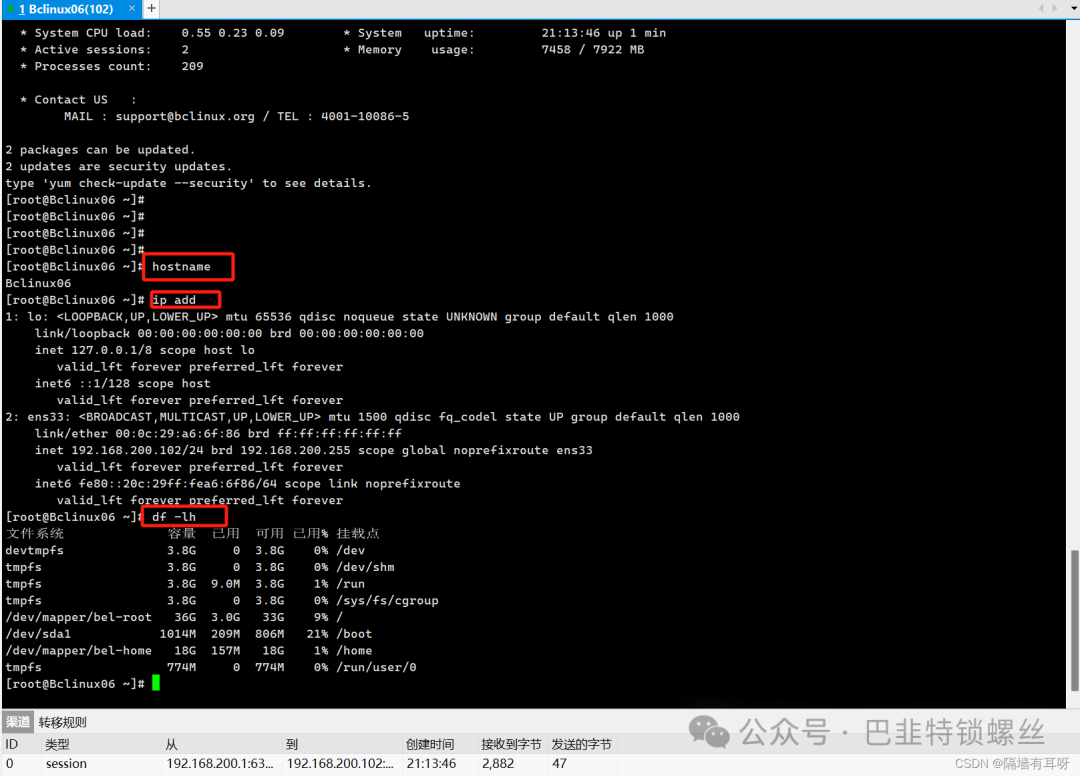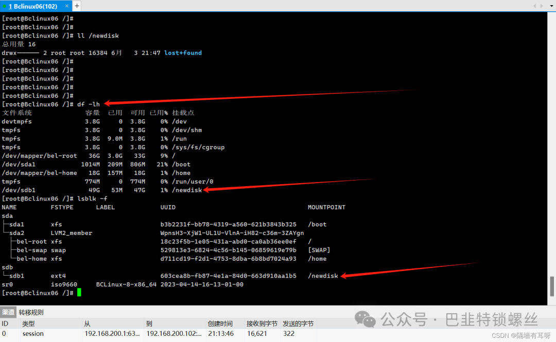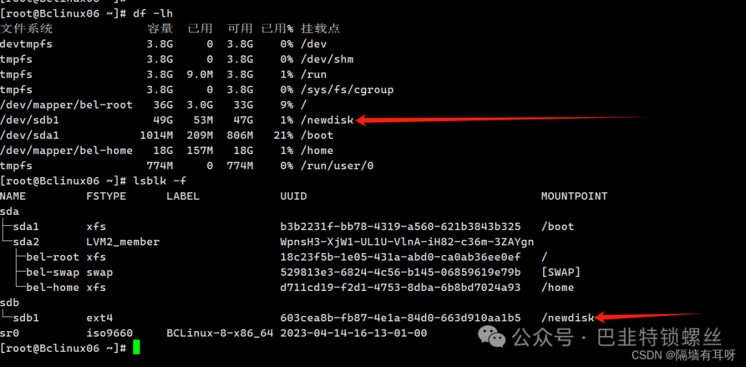 [root@Bclinux06 /]# df -lh文件系统 容量 已用 可用 已用% 挂载点devtmpfs 3.8G 0 3.8G 0% /devtmpfs 3.8G 0 3.8G 0% /dev/shmtmpfs 3.8G 9.0M 3.8G 1% /runtmpfs 3.8G 0 3.8G 0% /sys/fs/cgroup/dev/mapper/bel-root 36G 3.0G 33G 9% //dev/sda1 1014M 209M 806M 21% /boot/dev/mapper/bel-home 18G 157M 18G 1% /hometmpfs 774M 0 774M 0% /run/user/0/dev/sdb1 49G 53M 47G 1% /newdisk[root@Bclinux06 /]# lsblk -fNAME FSTYPE LABEL UUID MOUNTPOINTsda├─sda1 xfs b3b2231f-bb78-4319-a560-621b3843b325 /boot└─sda2 LVM2_member WpnsH3-XjW1-UL1U-VlnA-iH82-c36m-3ZAYgn├─bel-root xfs 18c23f5b-1e05-431a-abd0-ca0ab36ee0ef /├─bel-swap swap 529813e3-6824-4c56-b145-06859619e79b [SWAP]└─bel-home xfs d711cd19-f2d1-4753-8dba-6b8bd7024a93 /homesdb└─sdb1 ext4 603cea8b-fb87-4e1a-84d0-663d910aa1b5 /newdisksr0 iso9660 BCLinux-8-x86_64 2023-04-14-16-13-01-00[root@Bclinux06 /]#