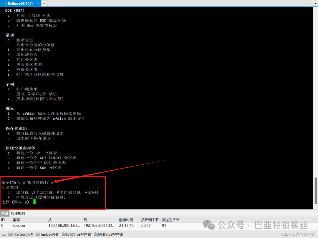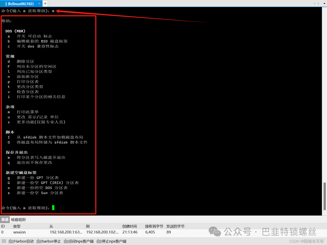命令(输入 m 获取帮助):m帮助:DOS (MBR)a 开关 可启动 标志b 编辑嵌套的 BSD 磁盘标签c 开关 dos 兼容性标志常规d 删除分区F 列出未分区的空闲区l 列出已知分区类型n 添加新分区p 打印分区表t 更改分区类型v 检查分区表i 打印某个分区的相关信息杂项m 打印此菜单u 更改 显示/记录 单位x 更多功能(仅限专业人员)脚本I 从 sfdisk 脚本文件加载磁盘布局O 将磁盘布局转储为 sfdisk 脚本文件保存并退出w 将分区表写入磁盘并退出q 退出而不保存更改新建空磁盘标签g 新建一份 GPT 分区表G 新建一份空 GPT (IRIX) 分区表o 新建一份的空 DOS 分区表s 新建一份空 Sun 分区表命令(输入 m 获取帮助):