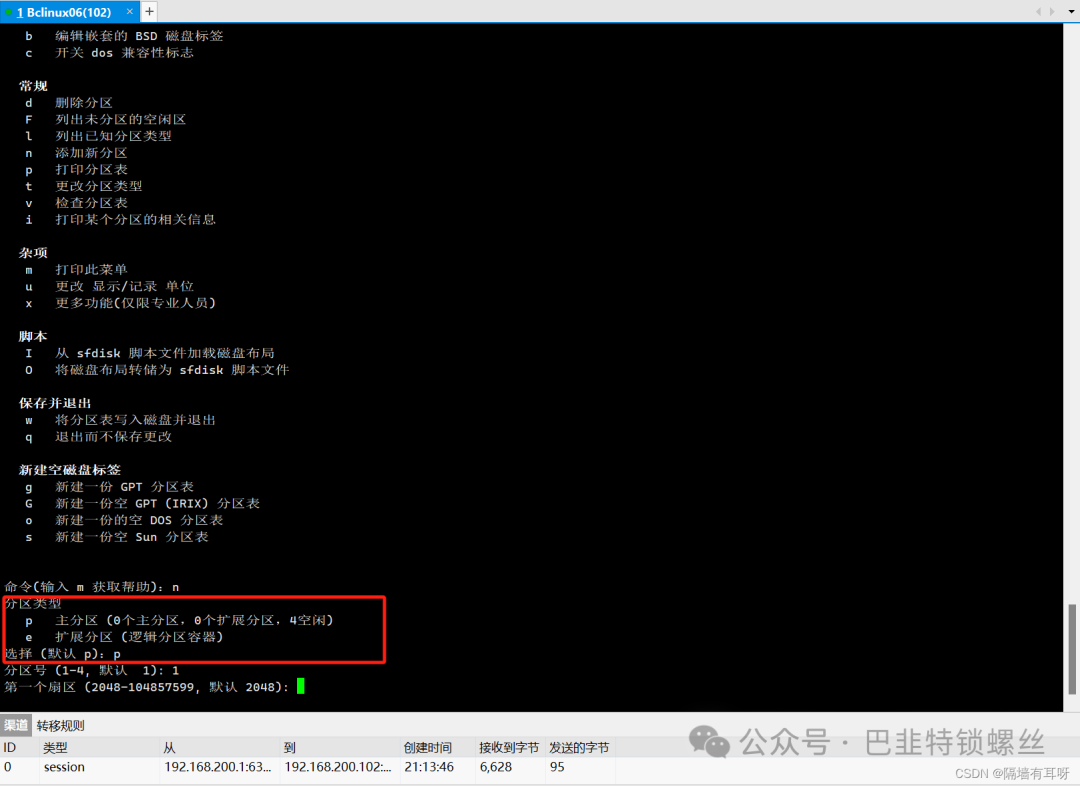 [root@Bclinux06 ~]# fdisk /dev/sdb欢迎使用 fdisk (util-linux 2.32.1)。更改将停留在内存中,直到您决定将更改写入磁盘。使用写入命令前请三思。设备不包含可识别的分区表。创建了一个磁盘标识符为 0x3c4493d5 的新 DOS 磁盘标签。命令(输入 m 获取帮助):