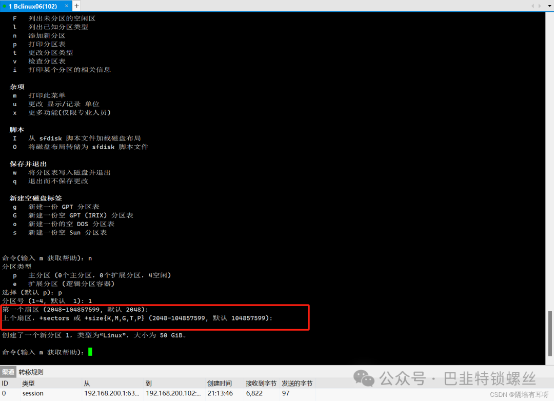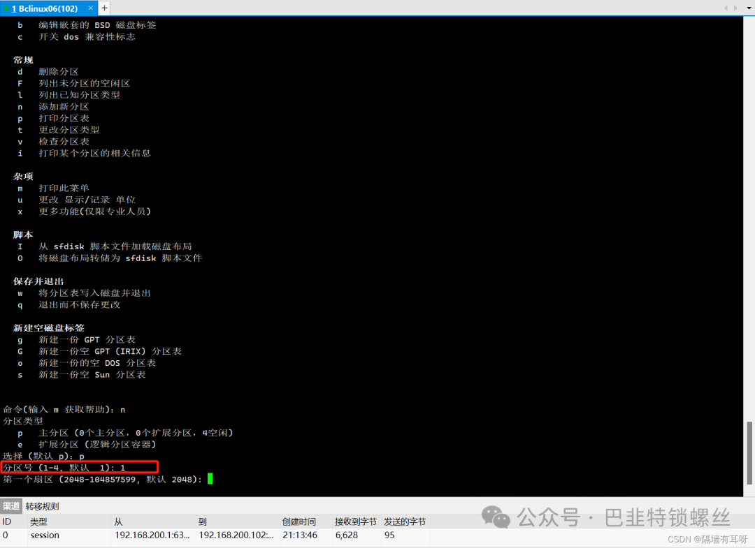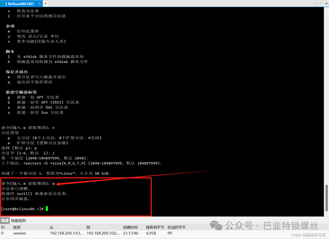 命令(输入 m 获取帮助):w分区表已调整。将调用 ioctl() 来重新读分区表。正在同步磁盘。[root@Bclinux06 ~]#