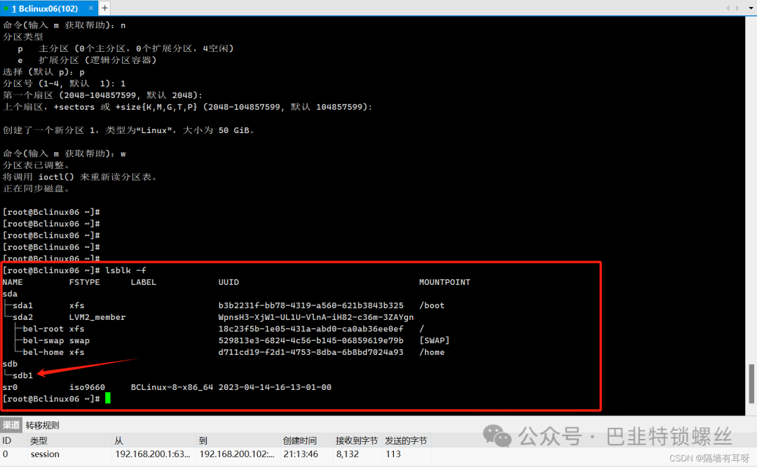 [root@Bclinux06 ~]# lsblk -fNAME FSTYPE LABEL UUID MOUNTPOINTsda├─sda1 xfs b3b2231f-bb78-4319-a560-621b3843b325 /boot└─sda2 LVM2_member WpnsH3-XjW1-UL1U-VlnA-iH82-c36m-3ZAYgn├─bel-root xfs 18c23f5b-1e05-431a-abd0-ca0ab36ee0ef /├─bel-swap swap 529813e3-6824-4c56-b145-06859619e79b [SWAP]└─bel-home xfs d711cd19-f2d1-4753-8dba-6b8bd7024a93 /homesdb└─sdb1sr0 iso9660 BCLinux-8-x86_64 2023-04-14-16-13-01-00[root@Bclinux06 ~]#