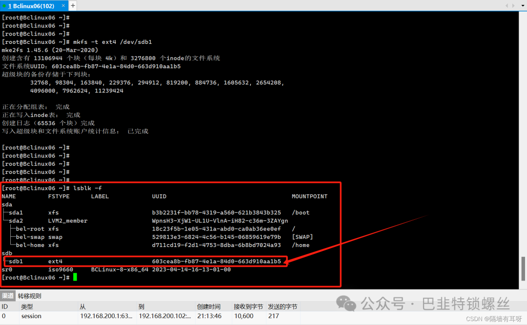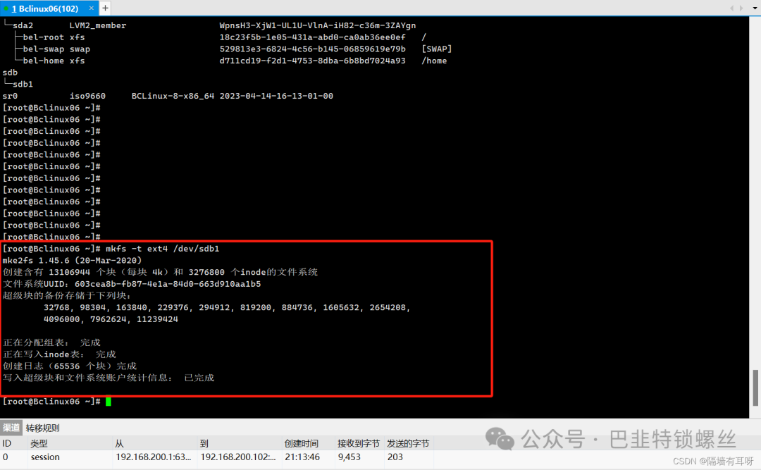 [root@Bclinux06 ~]# mkfs -t ext4 /dev/sdb1mke2fs 1.45.6 (20-Mar-2020)创建含有 13106944 个块(每块 4k)和 3276800 个inode的文件系统文件系统UUID:603cea8b-fb87-4e1a-84d0-663d910aa1b5超级块的备份存储于下列块:32768, 98304, 163840, 229376, 294912, 819200, 884736, 1605632, 2654208,4096000, 7962624, 11239424正在分配组表:完成正在写入inode表:完成创建日志(65536 个块)完成写入超级块和文件系统账户统计信息:已完成[root@Bclinux06 ~]#