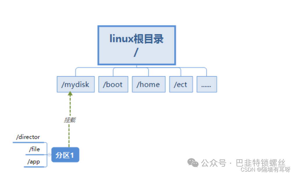 linux中只有一个根目录,根目录下衍生出其他子目录,如果说把一个分区比作一个存放物品的箱子,如果要想linux系统使用这个箱子存放内容,那么就需要先把这个箱子挂在linux系统目录结构中的一个目录上。
