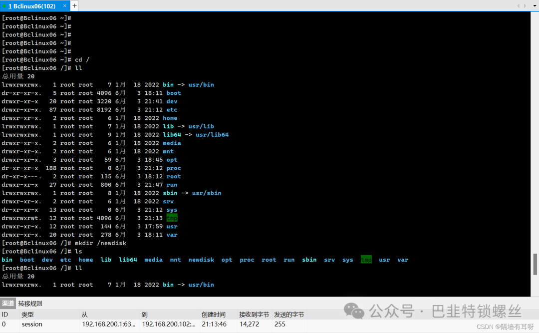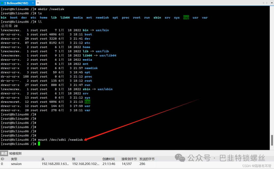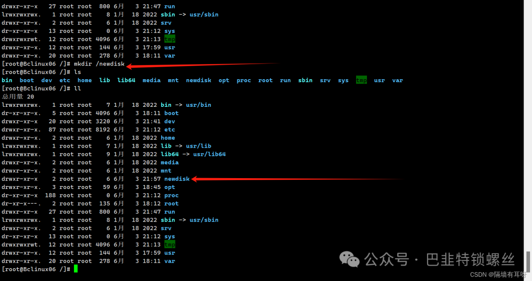 [root@Bclinux06 ~]# cd /[root@Bclinux06 /]# ll总用量 20lrwxrwxrwx. 1 root root 7 1月 18 2022 bin -> usr/bindr-xr-xr-x. 5 root root 4096 6月 3 18:11 bootdrwxr-xr-x 20 root root 3220 6月 3 21:41 devdrwxr-xr-x. 87 root root 8192 6月 3 21:12 etcdrwxr-xr-x. 2 root root 6 1月 18 2022 homelrwxrwxrwx. 1 root root 7 1月 18 2022 lib -> usr/liblrwxrwxrwx. 1 root root 9 1月 18 2022 lib64 -> usr/lib64drwxr-xr-x. 2 root root 6 1月 18 2022 mediadrwxr-xr-x. 2 root root 6 1月 18 2022 mntdrwxr-xr-x. 3 root root 59 6月 3 18:45 optdr-xr-xr-x 188 root root 0 6月 3 21:12 procdr-xr-x---. 2 root root 135 6月 3 18:12 rootdrwxr-xr-x 27 root root 800 6月 3 21:47 runlrwxrwxrwx. 1 root root 8 1月 18 2022 sbin -> usr/sbindrwxr-xr-x. 2 root root 6 1月 18 2022 srvdr-xr-xr-x 13 root root 0 6月 3 21:12 sysdrwxrwxrwt. 12 root root 4096 6月 3 21:13 tmpdrwxr-xr-x. 12 root root 144 6月 3 17:59 usrdrwxr-xr-x. 20 root root 278 6月 3 18:11 var[root@Bclinux06 /]# mkdir /newdisk[root@Bclinux06 /]# lsbin boot dev etc home lib lib64 media mnt newdisk opt proc root run sbin srv sys tmp usr var[root@Bclinux06 /]# ll总用量 20lrwxrwxrwx. 1 root root 7 1月 18 2022 bin -> usr/bindr-xr-xr-x. 5 root root 4096 6月 3 18:11 bootdrwxr-xr-x 20 root root 3220 6月 3 21:41 devdrwxr-xr-x. 87 root root 8192 6月 3 21:12 etcdrwxr-xr-x. 2 root root 6 1月 18 2022 homelrwxrwxrwx. 1 root root 7 1月 18 2022 lib -> usr/liblrwxrwxrwx. 1 root root 9 1月 18 2022 lib64 -> usr/lib64drwxr-xr-x. 2 root root 6 1月 18 2022 mediadrwxr-xr-x. 2 root root 6 1月 18 2022 mntdrwxr-xr-x 2 root root 6 6月 3 21:57 newdiskdrwxr-xr-x. 3 root root 59 6月 3 18:45 optdr-xr-xr-x 188 root root 0 6月 3 21:12 procdr-xr-x---. 2 root root 135 6月 3 18:12 rootdrwxr-xr-x 27 root root 800 6月 3 21:47 runlrwxrwxrwx. 1 root root 8 1月 18 2022 sbin -> usr/sbindrwxr-xr-x. 2 root root 6 1月 18 2022 srvdr-xr-xr-x 13 root root 0 6月 3 21:12 sysdrwxrwxrwt. 12 root root 4096 6月 3 21:13 tmpdrwxr-xr-x. 12 root root 144 6月 3 17:59 usrdrwxr-xr-x. 20 root root 278 6月 3 18:11 var[root@Bclinux06 /]#