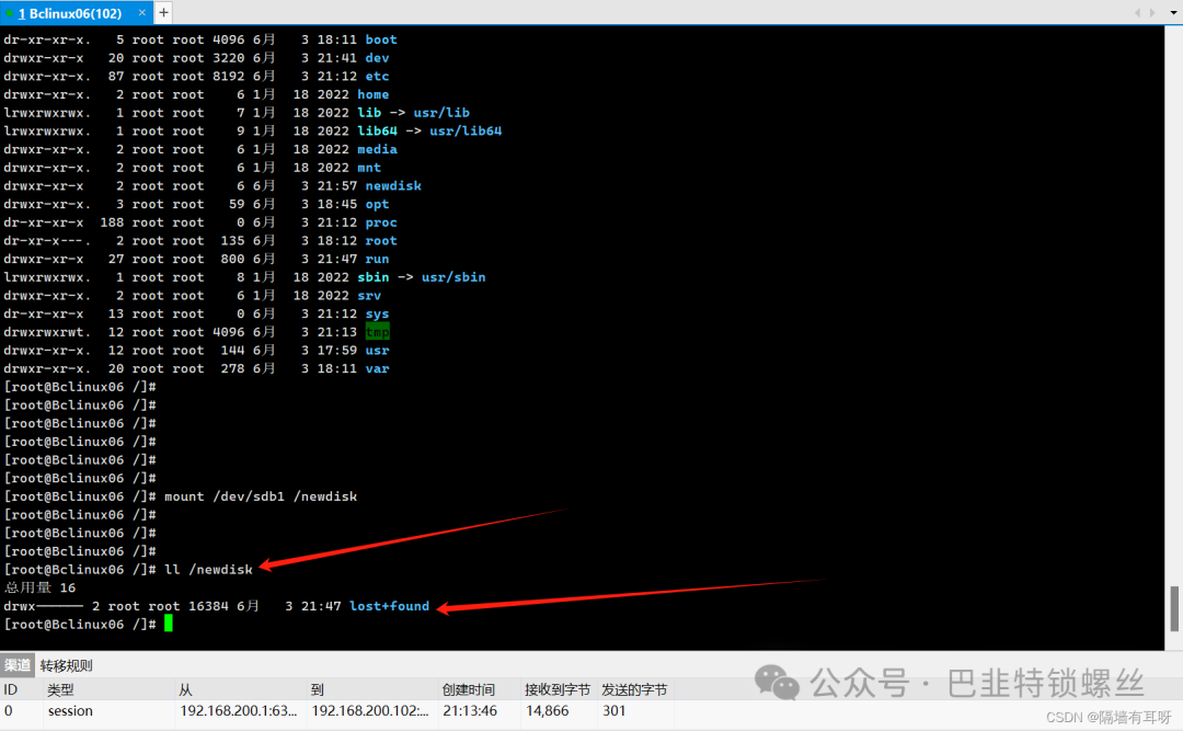 [root@Bclinux06 /]#[root@Bclinux06 /]# mount /dev/sdb1 /newdisk[root@Bclinux06 /]#
