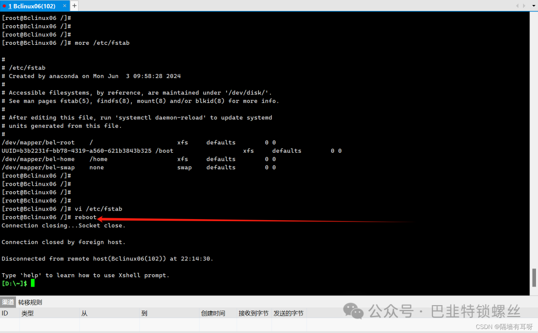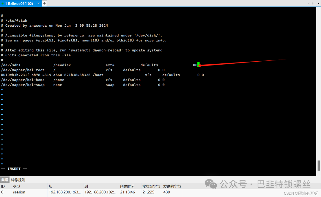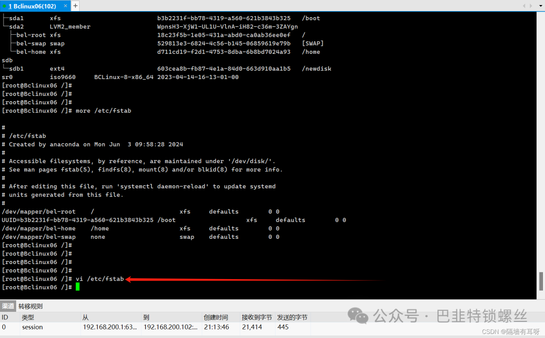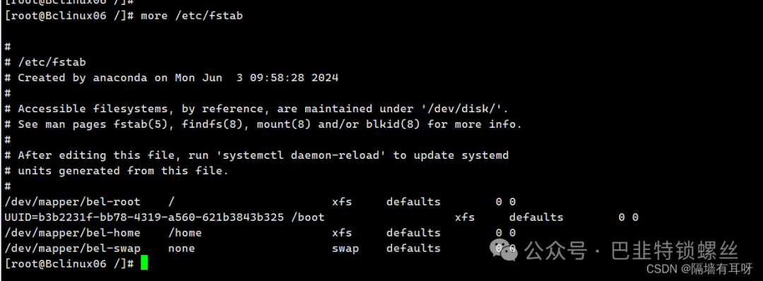 [root@Bclinux06 /]# more /etc/fstab## /etc/fstab# Created by anaconda on Mon Jun 3 09:58:28 2024## Accessible filesystems, by reference, are maintained under '/dev/disk/'.# See man pages fstab(5), findfs(8), mount(8) and/or blkid(8) for more info.## After editing this file, run 'systemctl daemon-reload' to update systemd# units generated from this file.#/dev/mapper/bel-root / xfs defaults 0 0UUID=b3b2231f-bb78-4319-a560-621b3843b325 /boot xfs defaults 0 0/dev/mapper/bel-home /home xfs defaults 0 0/dev/mapper/bel-swap none swap defaults 0 0[root@Bclinux06 /]#