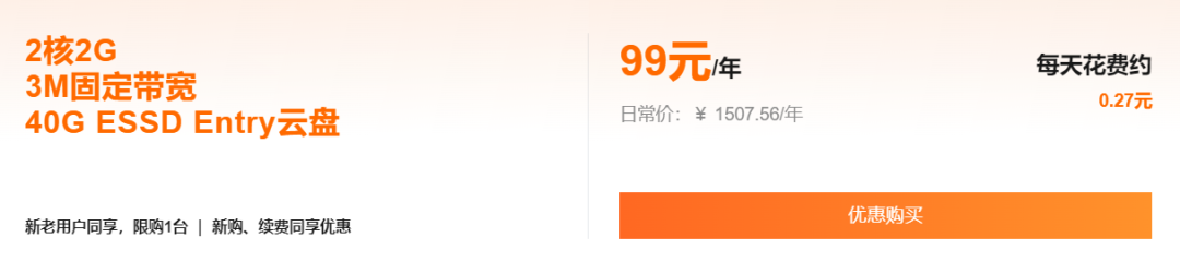 前言:要买服务器,建议在双十一购买,价格比平时便宜10倍,今年阿里云双十一活动的一款服务器2核2G 3M固定宽带,最低99元,就能购买1年,而且续费不涨价,同样还是99元,超级香,只限新用户 。