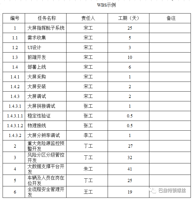 序号、工作包/任务名称、时间安排、成本费用、责任人。