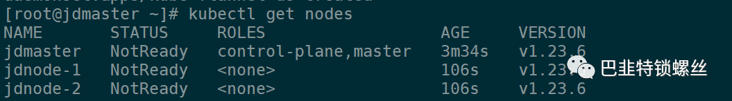 [root@jdmaster ~]# kubectl get nodesNAME STATUS ROLES AGE VERSIONjdmaster NotReady control-plane,master 3m34s v1.23.6jdnode-1 NotReady <none> 106s v1.23.6jdnode-2 NotReady <none> 106s v1.23.6