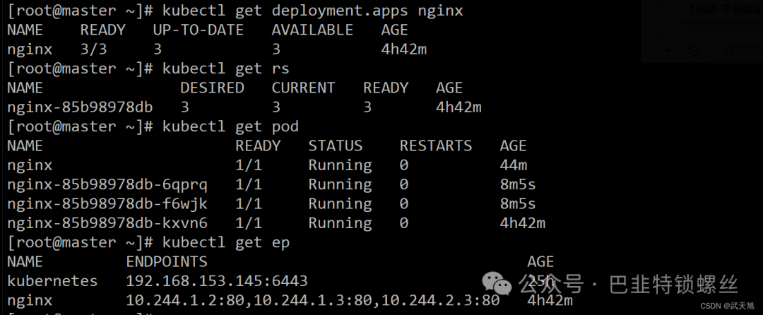 扩展后查看Nginx应用的Deployment、ReplicaSet、Pod、Endpoints资源: