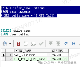 当索引状态显示为'UNUSABLE'或‘INVALID'时,表名索引失效或不可用。这时可能需要重新创建索引来修复这种情况。