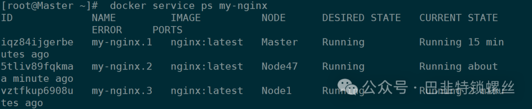 [root@Master ~]# docker service update --replicas 3 my-nginxmy-nginxoverall progress: 3 out of 3 tasks1/3: running2/3: running3/3: runningverify: Service converged[root@Master ~]# docker service lsID NAME MODE REPLICAS IMAGE PORTSy9y4iwq4u5k0 my-nginx replicated 3/3 nginx:latest *:8888->80/tcp[root@Master ~]# docker service ps my-nginxID NAME IMAGE NODE DESIRED STATE CURRENT STATE ERROR PORTSiqz84ijgerbe my-nginx.1 nginx:latest Master Running Running 15 minutes ago5tliv89fqkma my-nginx.2 nginx:latest Node47 Running Running about a minute agovztfkup6908u my-nginx.3 nginx:latest Node1 Running Running 2 minutes ago