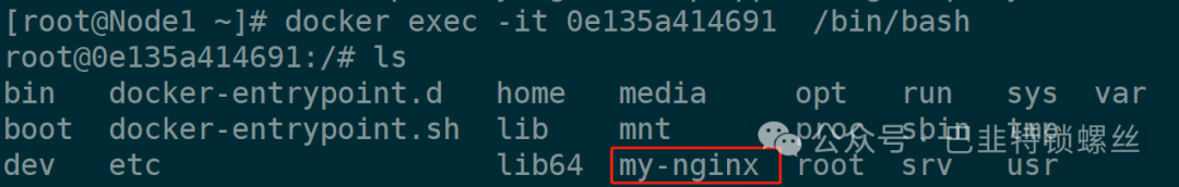 [root@Master ~]# docker exec -it 737f5dc28307 bin/bashroot@737f5dc28307:/# lsbin docker-entrypoint.d home media opt run sys varboot docker-entrypoint.sh lib mnt proc sbin tmpdev etc lib64 my-nginx root srv usrroot@737f5dc28307:/# cd my-nginx/root@737f5dc28307:/my-nginx# lsroot@737f5dc28307:/my-nginx# echo "This is volume test from docker-1" > hello.txtroot@737f5dc28307:/my-nginx# lshello.txt[root@Master ~]# docker volume inspect my-nginx[{"CreatedAt": "2024-03-06T13:12:28+08:00","Driver": "local","Labels": null,"Mountpoint": "/var/lib/docker/volumes/my-nginx/_data","Name": "my-nginx","Options": null,"Scope": "local"}][root@Master ~]# cd var/lib/docker/volumes/my-nginx/_data[root@Master _data]# lshello.txt